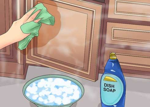 To break down grease and everyday buildup, mix two parts warm water with one part liquid dish soap. Use a soft sponge or cloth to gently wipe down cabinet surfaces, being careful not to oversaturate the wood or finish. Once clean, wipe everything again with a damp cloth to remove soap residue.