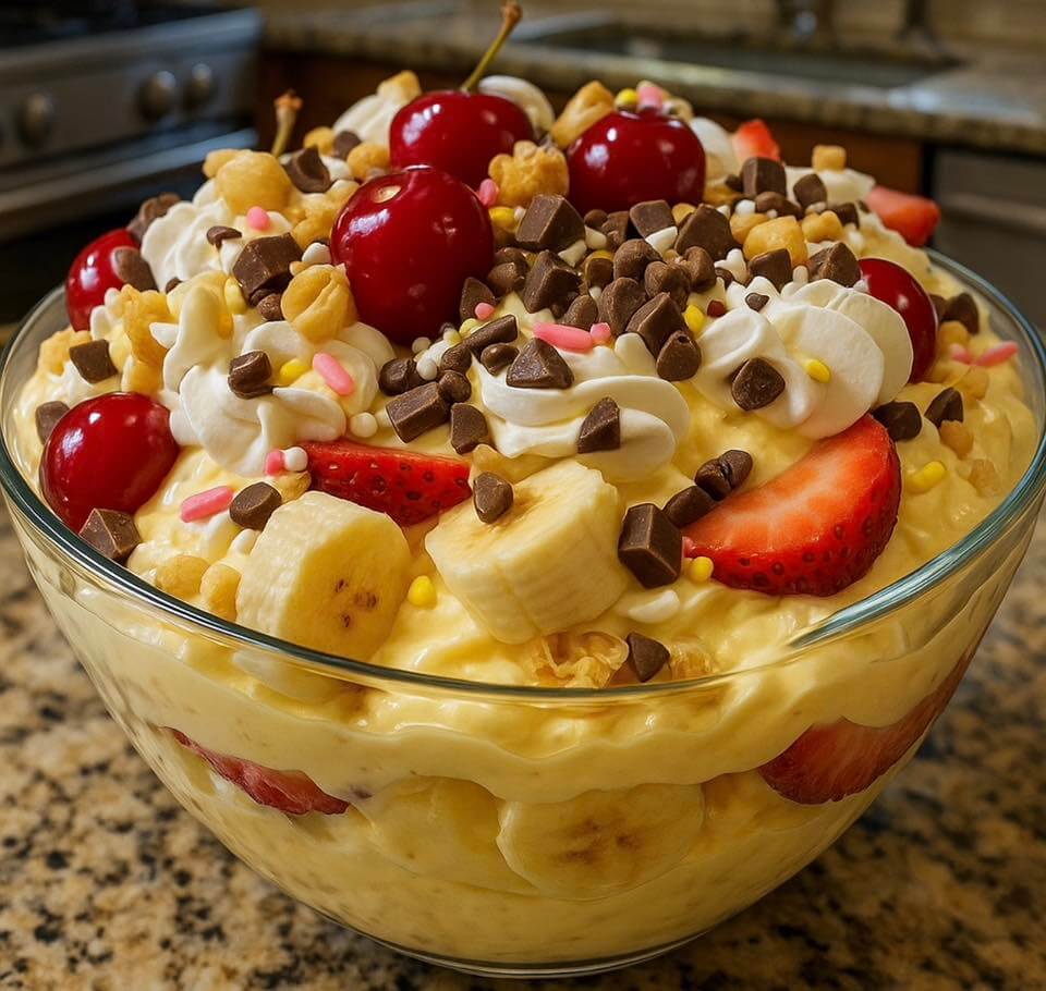 This dessert captures all the flavors of a traditional banana split—bananas, strawberries, pineapple, marshmallows, and whipped topping—without the ice cream. It’s light, fluffy, and perfect for potlucks, parties, or a quick treat at home.