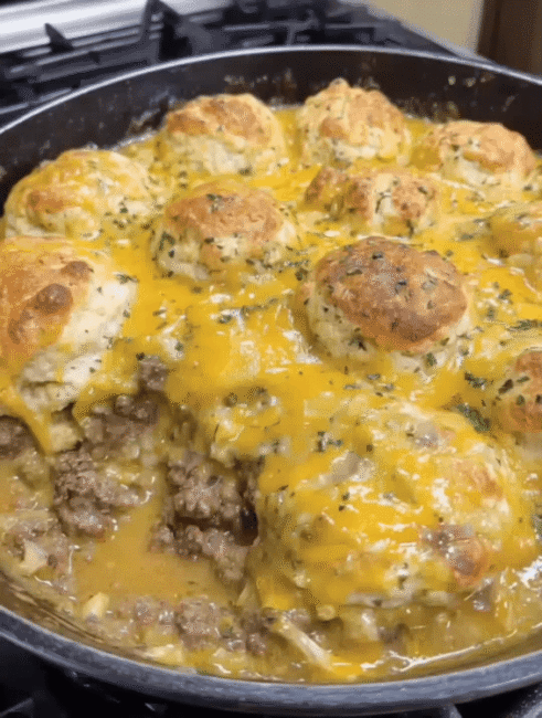 This hearty casserole layers seasoned ground beef, creamy mushroom sauce, melted cheddar, and golden garlic-butter biscuits on top for a dish that’s cozy, rich, and perfect for feeding a crowd.