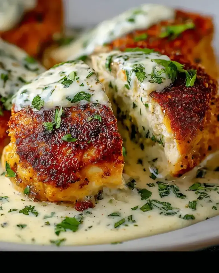 Remove the chicken pillows from the oven and pour the creamy Parmesan sauce over them. Finish with a sprinkle of fresh parsley and serve warm.