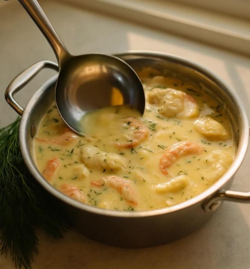 Blend the base with an immersion blender before adding seafood for a smoother consistency.