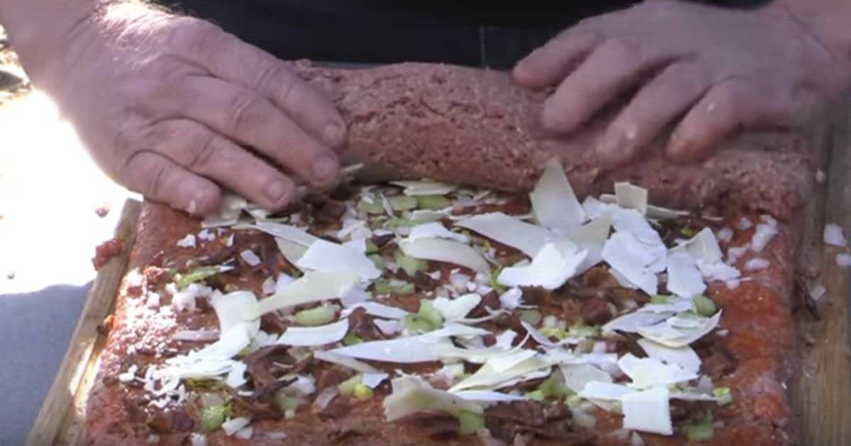 This unique take on meatloaf, inspired by the BBQ Pit Boys, turns the classic dish into something a little more exciting. The meat mixture is flattened out, filled with cheese, rolled up tightly, and wrapped with bacon to create a flavorful meatloaf roll.