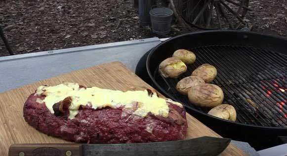 Once it’s assembled, the roll goes straight onto the barbecue instead of into the oven. Cooking it low and slow on the grill allows the bacon to crisp up while the meat stays juicy and tender inside.