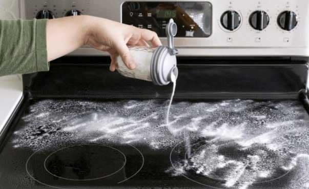 All you need is some baking soda, liquid dish soap, distilled vinegar, and a towel. Start by filling a spray bottle with vinegar and generously spritzing the entire stovetop.