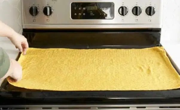 Now, grab a towel and soak it in really hot water with a little dish soap mixed in. Make sure the water is hot enough to help break down the grime—gloves are a smart idea here to protect your hands. Wring the towel out just a bit so it’s damp but not dripping, then lay it across the stovetop. Let it sit for 15 to 20 minutes.
