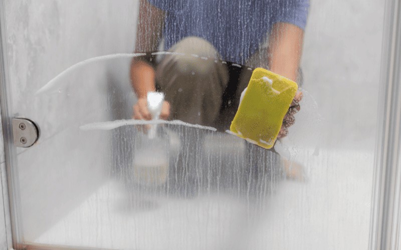 The combination of dish soap and Jet Dry helps break down soap scum and mineral deposits without damaging the glass. Plus, using a wand with a non-scratch pad makes the process safe and efficient.