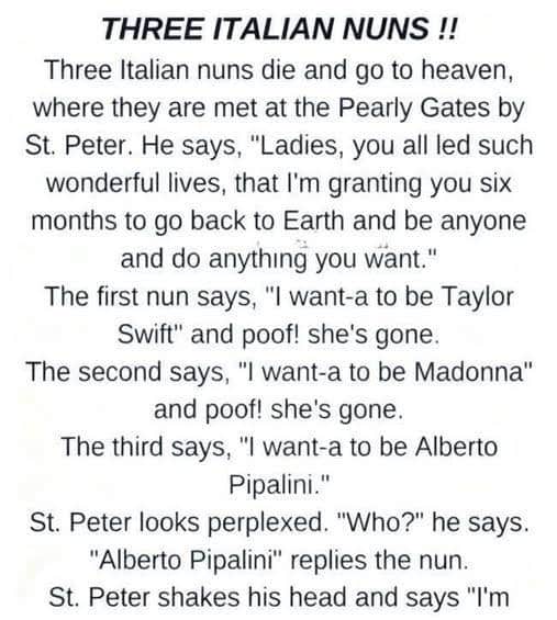 At the Pearly Gates, under clouds lined up like a perfectly organized display, three Italian nuns arrived together. They had lived long lives filled with service, prayer, and quiet dedication. They stood side by side, hands folded, habits neat, faces calm but curious. St. Peter greeted them warmly as he checked their names on a glowing list.