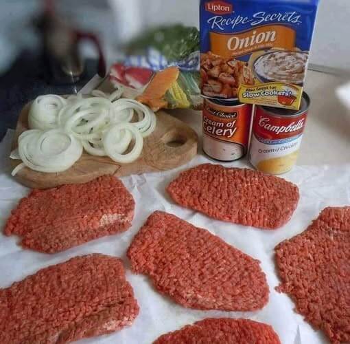 In the slow cooker, layer the cube steaks, sliced onion, cream of chicken soup, cream of celery soup, Lipton Onion Soup Mix, and water.