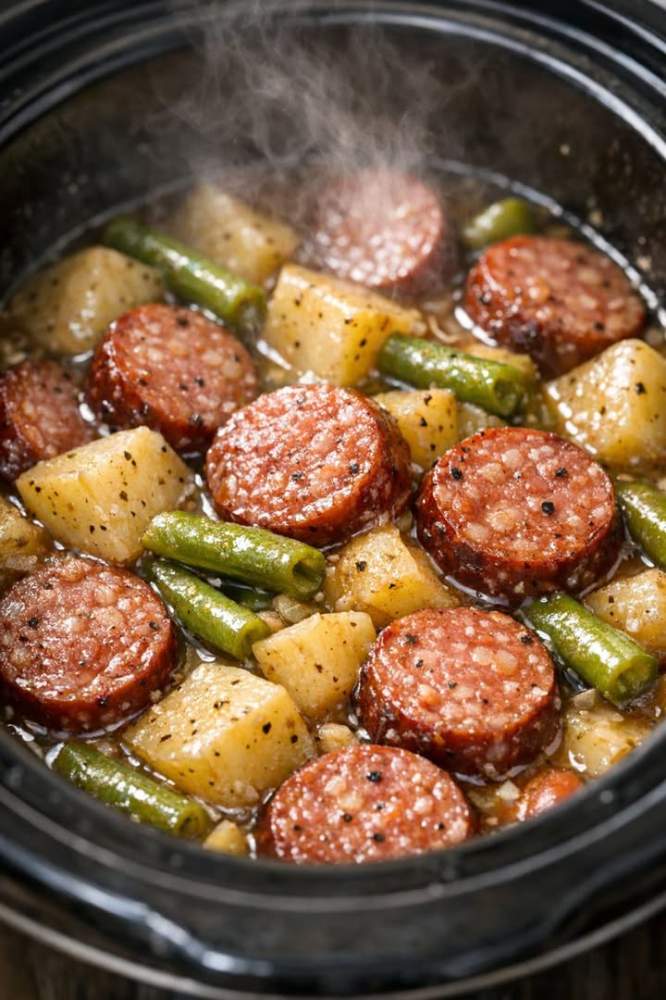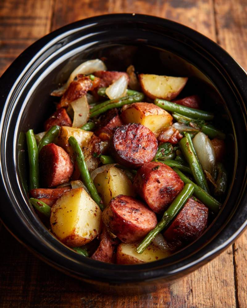4-Ingredient Slow Cooker Sausage, Potato & Green Bean Casserole