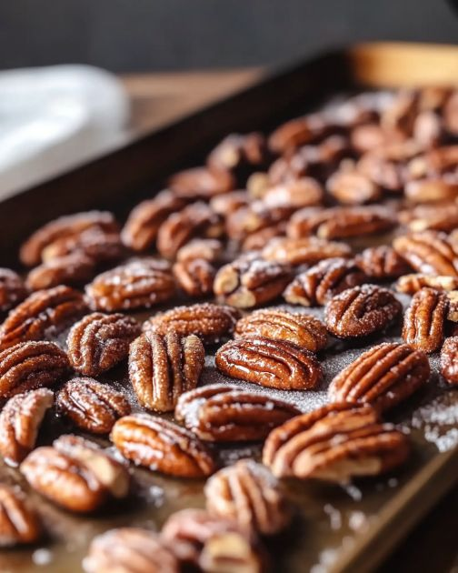 - After cooking, spread the pecans on a parchment-lined baking sheet to cool and harden.