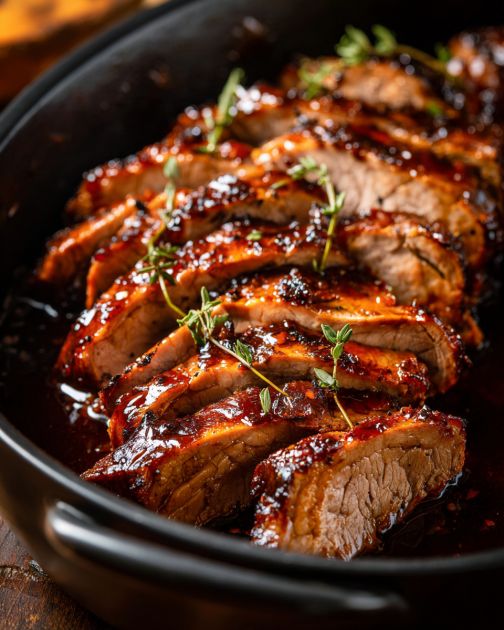 - Drizzle the thickened glaze over the pork and garnish with fresh thyme before serving.
