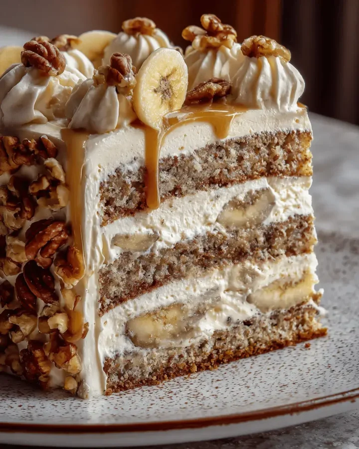 A wonderfully moist banana cake studded with crunchy walnuts and topped with luscious creamy frosting, perfect for sharing with family or friends. This cake has a tender crumb and rich flavor that will make it a favorite at any gathering.