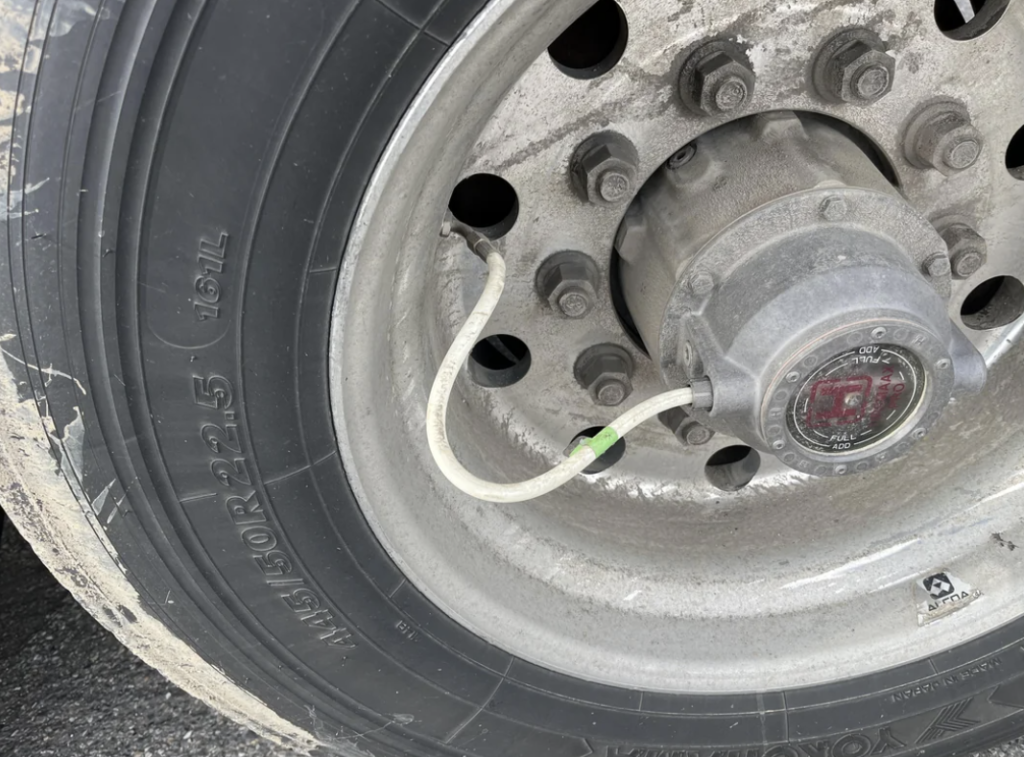The most visible clue is usually a small hose or cable running to the wheel hub. That line connects into a hub assembly with a rotary union so air can flow while the wheel spins.