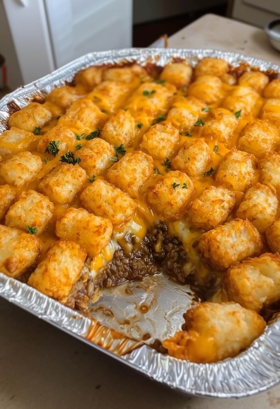 Bake uncovered for 30–35 minutes, until the tater tots are golden and crispy. -