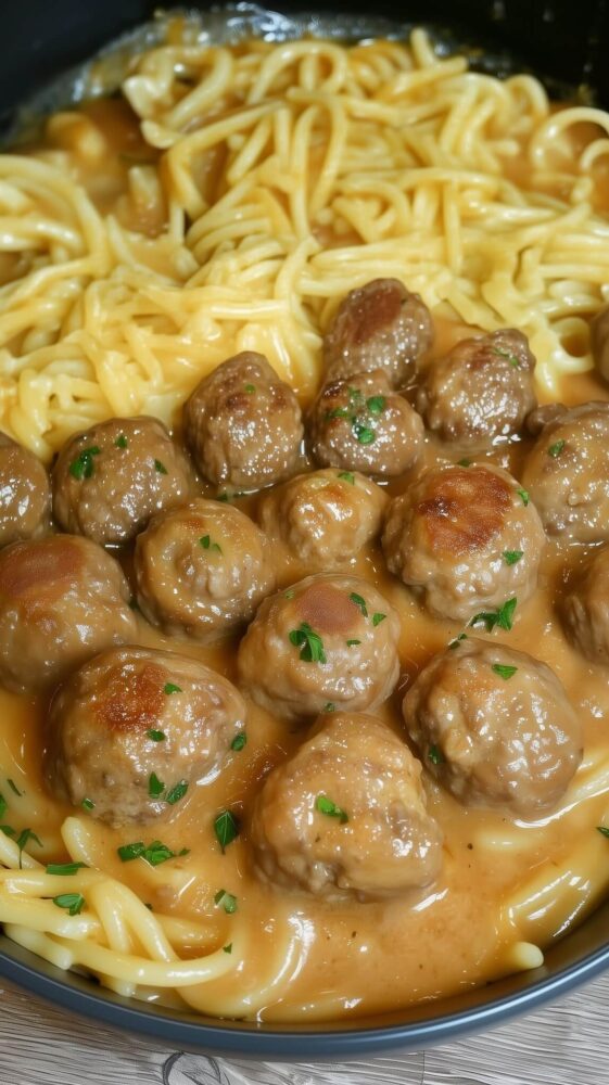 Return the meatballs to the skillet, gently warming them in the gravy. Serve immediately over mashed potatoes or classic egg noodles for a comforting, flavorful meal everyone will love.
