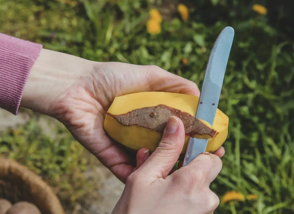 Instead of peeling the potatoes, the method keeps the skins on — which adds extra texture and nutrients. After washing them well, the skins get lightly coated with avocado oil. The potatoes are then cut in half, placed in a pot, and boiled in a mix of chicken stock and water with a bit of salt.