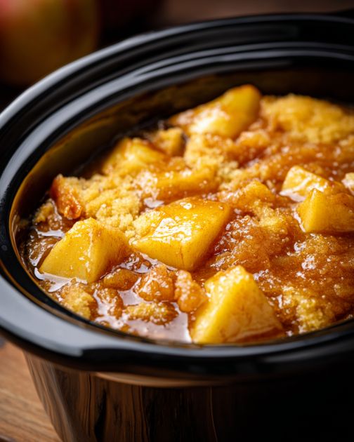 - Cover and cook on HIGH for 2–2 1/2 hours or on LOW for 4–5 hours, until the topping looks mostly set with lightly golden edges and bubbling apples underneath.