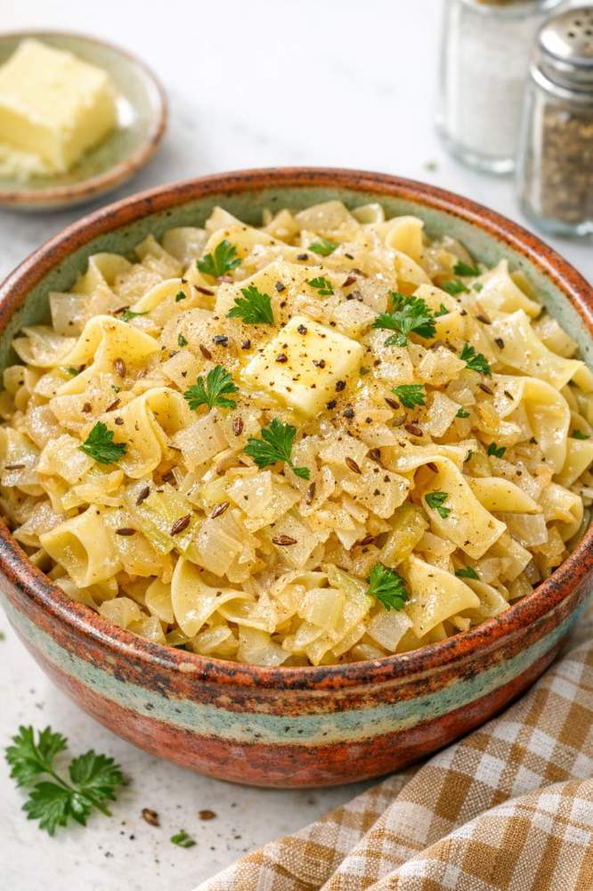 For added protein, stir in sliced cooked kielbasa, smoked sausage, or shredded rotisserie chicken near the end of cooking. For a vegetarian boost, mix in drained white beans or chickpeas with the noodles. Add a splash of apple cider vinegar or a spoonful of sauerkraut for a tangy finish. To make it creamier, fold in sour cream or Greek yogurt just before serving. Thinly sliced carrots or bell peppers can be added at the start for extra color and nutrition. Prep cabbage and onions the night before to save time in the morning. If you like a little crunch, stir in a handful of fresh raw cabbage right before serving for added texture.