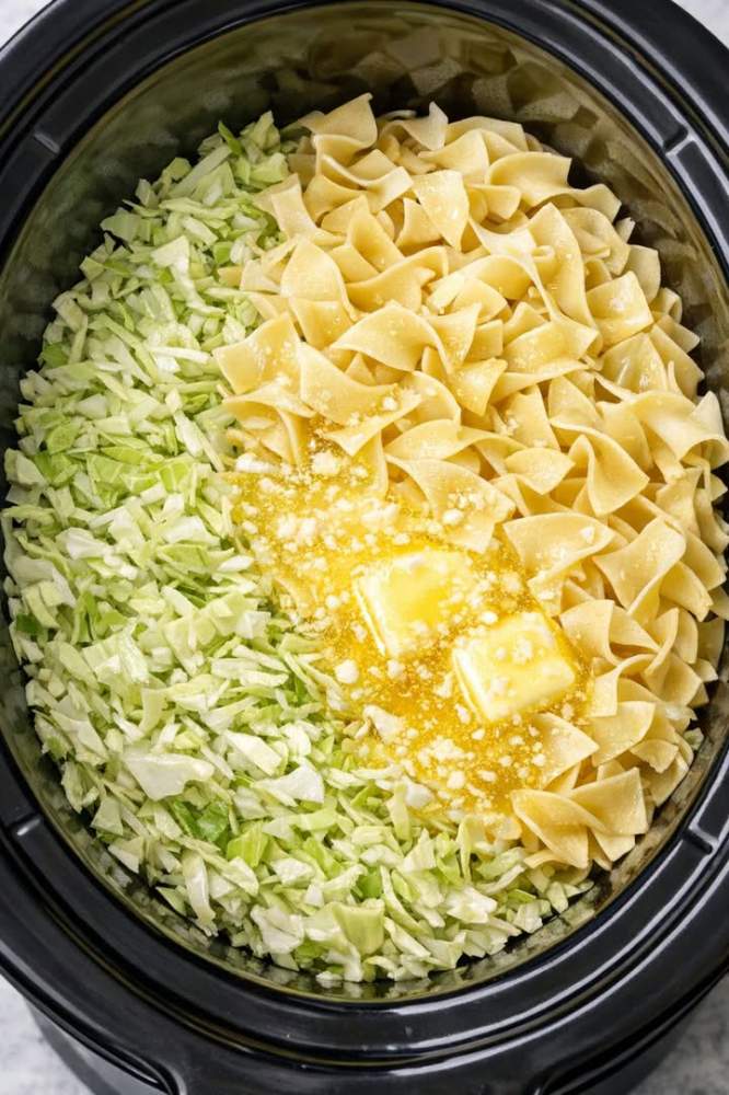 Thinly slice the cabbage and onion. Add them to a 4–6 quart slow cooker.